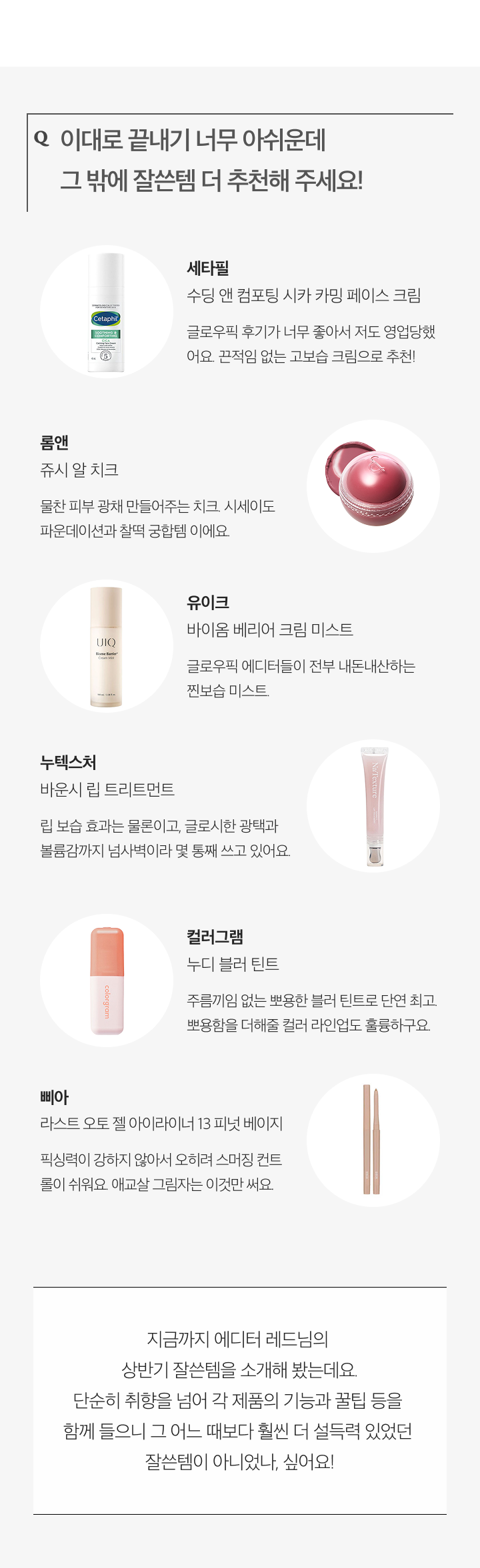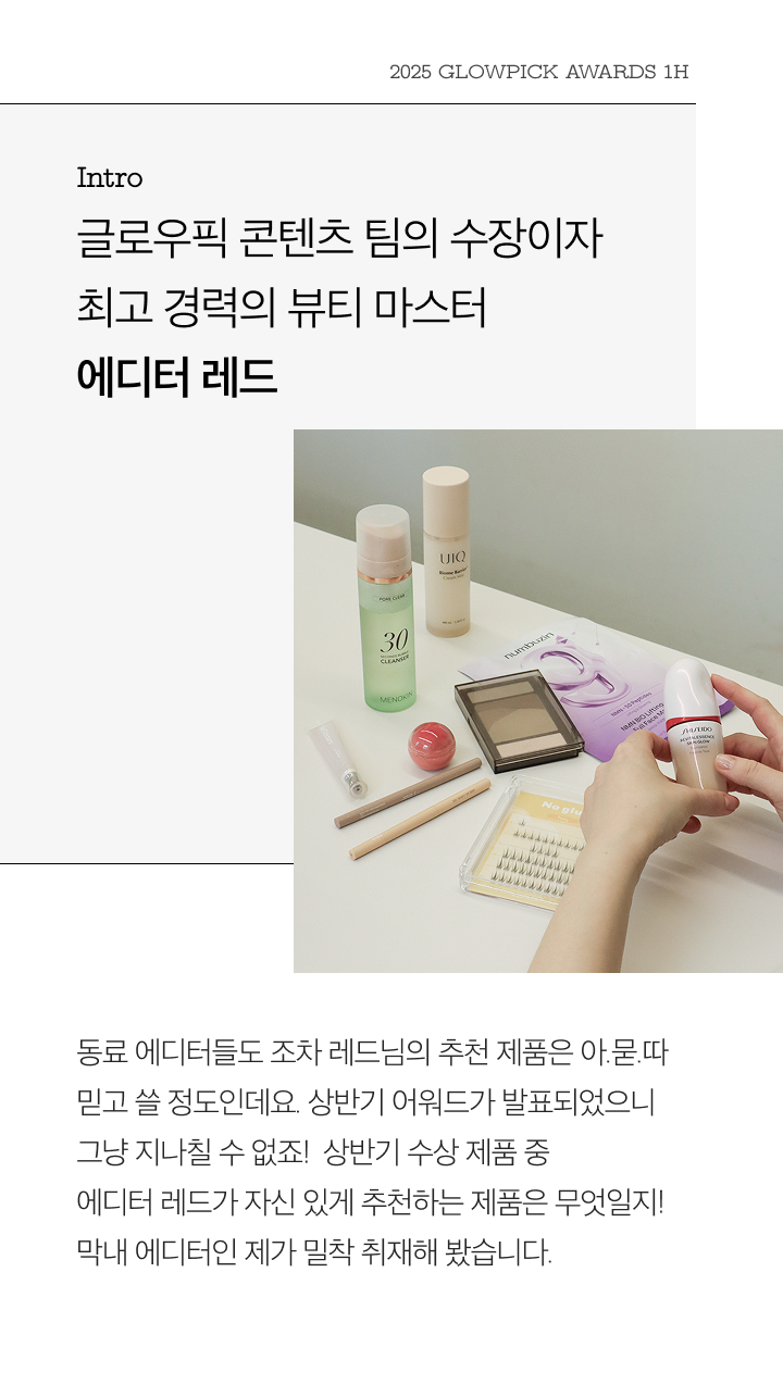 글로우픽 에디터들의 수장이자 뷰티 마스터인 에디터 레드의 상반기 잘쓴템은 무엇일까요? 뷰티력 만랩 에디터의 관록과 노하우로 선정한 잘쓴템들을 확인해 보세요.
