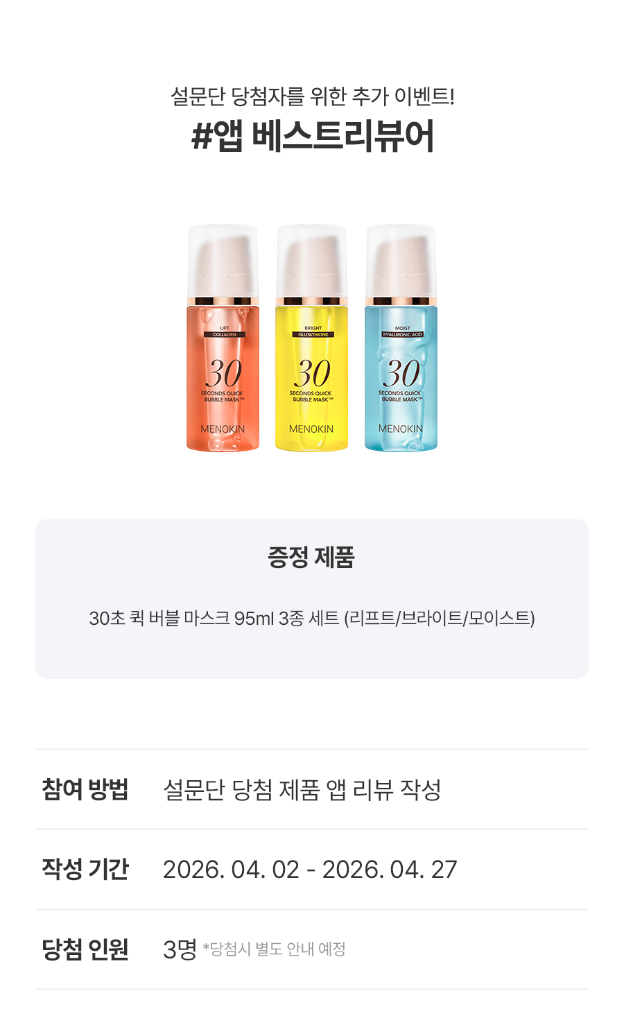 [메노킨 (MENOKIN)] '30초 퀵 버블 마스크 모이스트' 설문단 500명 모집